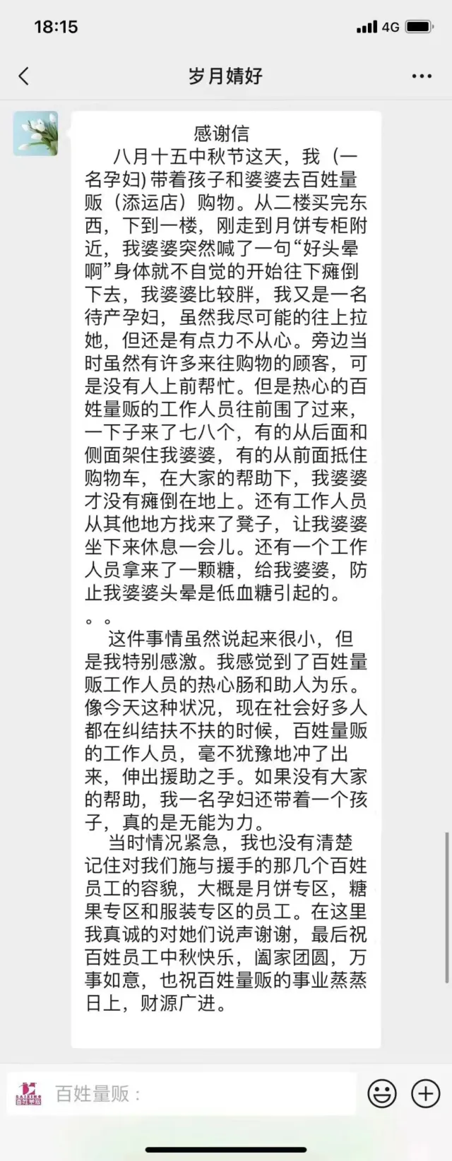 9月18日,百姓量販添運(yùn)店收到了一封來(lái)自于一位顧客的感謝信,信中顧客寫到她是一位孕婦,在中秋節(jié)當(dāng)天帶著孩子與婆婆一同去百姓量販添運(yùn)店進(jìn)行購(gòu)物,在購(gòu)物途中老人因低血糖暈倒,在附近的百姓人毫不猶豫的沖上前幫助老人。有的員工為顧客拿糖塊,有的員工為顧客拿了凳子。顧客在信中對(duì)百姓人熱心助人表達(dá)了深深的感謝。