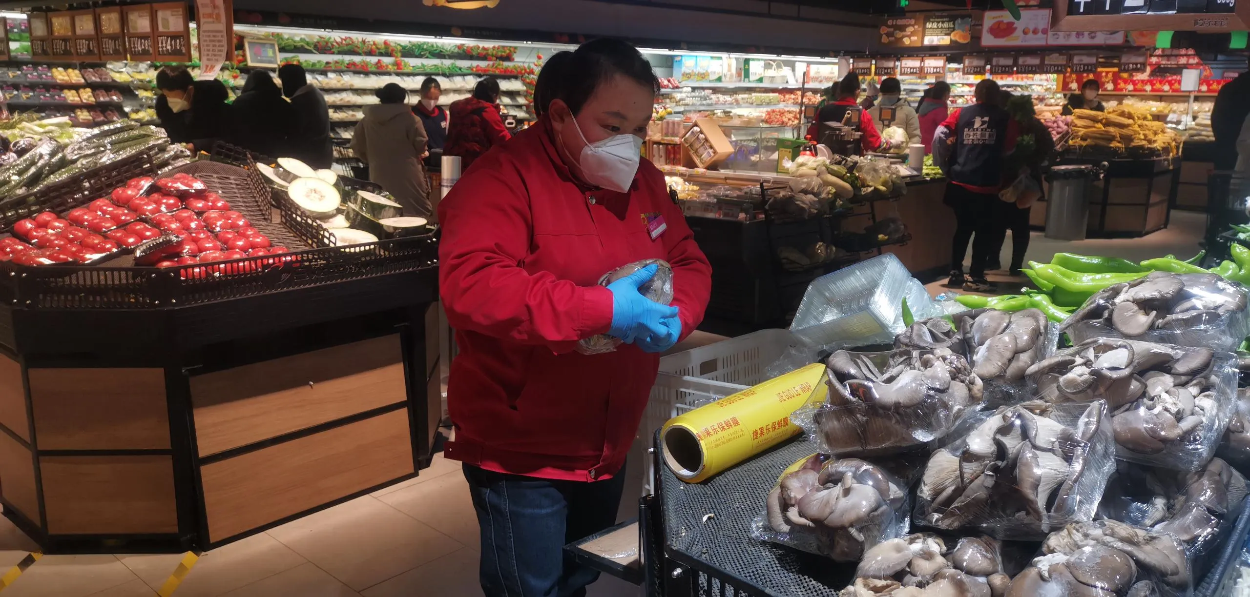 店長看蔬菜區(qū)缺人嚴重,就安排其他貨道員工在蔬菜區(qū)幫忙上貨、捆菜扎菜、打掃衛(wèi)生,就算有其他家人幫忙,宋彥利依舊堅持在崗位。店長怕她身體不適就讓她中午吃完飯多休息一會,宋彥利寶姐嘴上答應(yīng)著休息,但是依舊吃完飯馬上回到崗位上繼續(xù)工作,就這樣一直堅持到員工能夠來上班到崗,她才回家休息了一天,就又投入到緊張的工作當中。