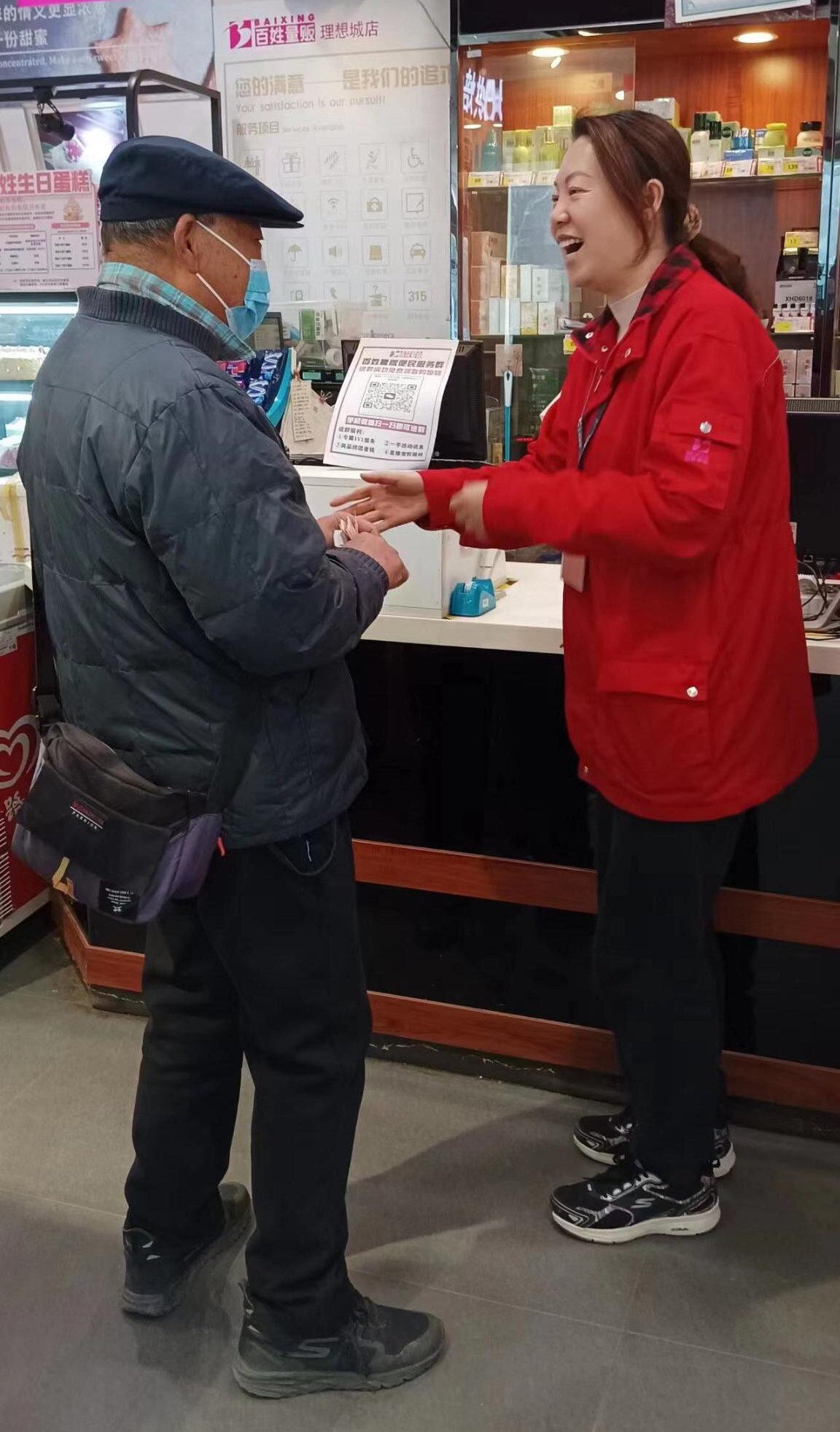 店長段麗麗仔細分析確定撿包的阿姨還會來門店,于是每天巡視賣場,最后終于找到了這個撿錢包的阿姨,和這位阿姨溝通完后,阿姨把丟失的300多元現(xiàn)金及錢包返還給了張大爺。丟失錢包的大爺本來不抱什么希望了,當?shù)弥约旱腻X包失而復得,非常高興,連連感謝店長的關心及幫助,一直夸贊百姓員工熱心助人、品德高尚。