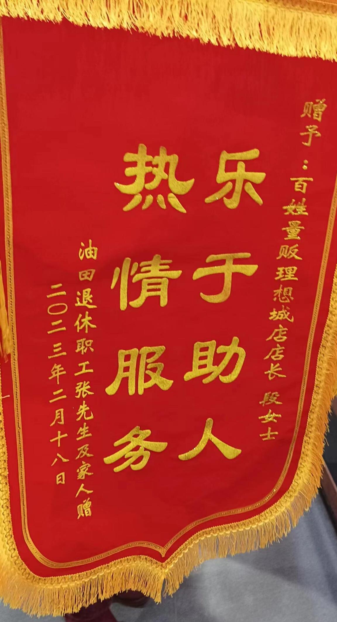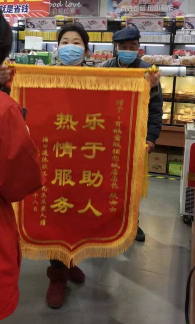 有位姓張的大爺和他的家人拿著一面“樂于助人,熱情服務”的錦旗來到理想城店,充滿感激之情要把錦旗送到理想城店店長段麗麗手中。