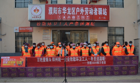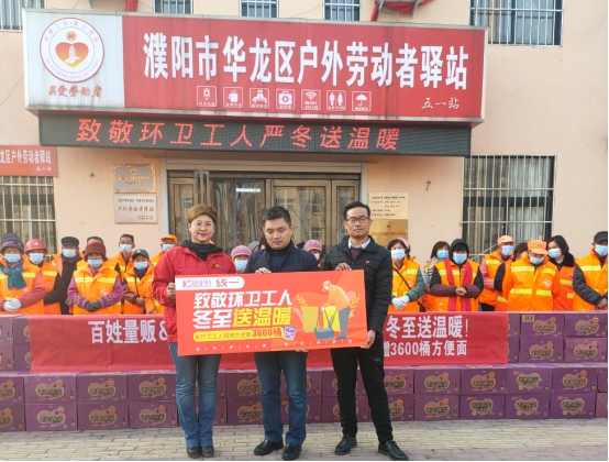 環(huán)衛(wèi)工人是城市環(huán)境的美容師,他們不分酷暑寒冬,每天奮戰(zhàn)在清潔環(huán)境的第一線。為了表達(dá)對(duì)一線環(huán)衛(wèi)工人的關(guān)懷,12月15日,濮陽(yáng)市百姓量販有限公司行政總監(jiān)柴志華及鄭州統(tǒng)一企業(yè)負(fù)責(zé)人來(lái)到濮陽(yáng)市華龍區(qū)戶外勞動(dòng)者驛站開(kāi)展慰問(wèn)活動(dòng),為環(huán)衛(wèi)工人們送來(lái)了3600桶方便面。
